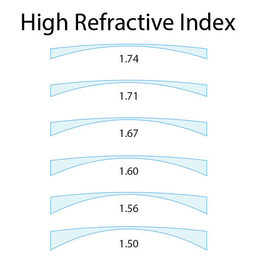 The higher the refractive index of a material, the slower light moves through it, which results in greater bending (refracting) of the light rays. So, the higher the refractive index of a lens material, the less lens material is required to bend light to the same degree as a lens with a lower refractive index.